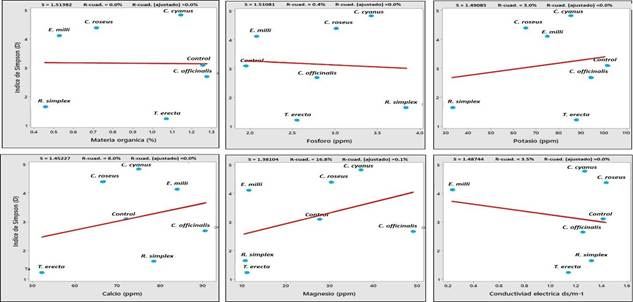 Los patrones encontrados en los diagramas de correlación de Person indican que, tanto en el índice de Shannon como en el índice de Simpson, las características edafológicas del suelo (Figura 7 y 8), se correlacionaron negativamente con el tipo de planta ornamental. Resultados similares de correlación negativa fueron reportados por Pacasa- Quisbert et al. (2017), al evaluar el efecto del tipo de uso del suelo, tipo de vegetación nativa y tipo de cultivo sobre la diversidad y número de hongos relacionados con parámetros físicos y químicos del suelo (pH, textura, materia orgánica), donde concluyeron que la abundancia microbiana está altamente relacionada con otros factores como; el tipo de suelo, características climáticas, otros microorganismos y hasta el tipo de comunidades de plantas.