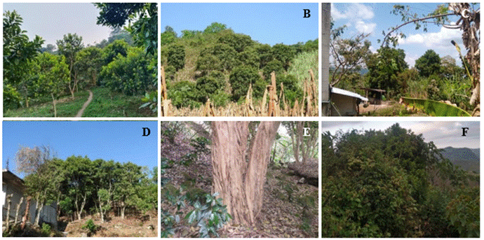 Figura 1 Sistemas de producción de pimienta gorda con manejo tradicional totonaco en Lipuntahuaca, Huehuetla, Puebla. A) Monocultivo; B) Intercalado con maíz; C) Huerto familiar; D) Cerca viva; E) Café bajo sombra de pimienta gorda; F) Acahual (asociaciones vegetales en áreas originalmente ocupadas por selvas).