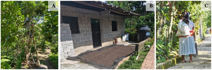 Figura 2 Producción de la pimienta gorda en Lipuntahuaca, Huehuetla Puebla. A) Corte de fruto verde en árboles de pimienta gorda; B) Asoleadero para fruto seco; C) Trasporte de fruto seco de pimienta gorda.