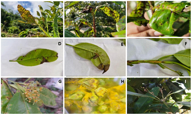Figura 3 Síntomas y signos de roya (Austropuccinia psidii) en pimienta gorda cultivada en Huehuetla, Puebla, México. A y B) Presencia de roya en hojas jóvenes; C y D) Pústulas en el haz de la hoja; E) Pústulas en el envés de la hoja, F) Pústulas en el tallo; G) Presencia de roya en botones florales; H) Visualización de botones florales infectados con roya; I) Necrosis y caída de botones florales causados por roya.