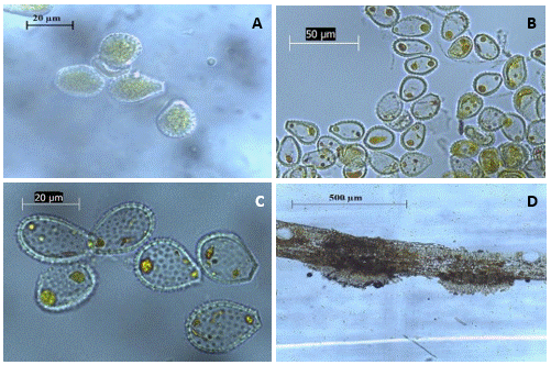Figura 4 Uredinios y uredioniosporas de la roya (Austropuccinia psidii) obtenidas de muestras vegetales colectadas en Huehuetla, Puebla. A -C) Visualización de uredioniosporas equinuladas con base truncada; D) Visualización de uredinios en un corte trasversal de hoja de pimienta gorda.