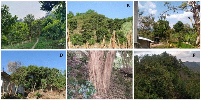 Figure 1 Allspice production systems under traditional Totonac management in Lipuntahuaca, Huehuetla, Puebla. A) Monoculture; B) Intercropped with corn; C) Home garden; D) Live fence; E) Coffee grown under allspice shade; F) Acahual (plant associations in areas originally occupied by tropical forests).