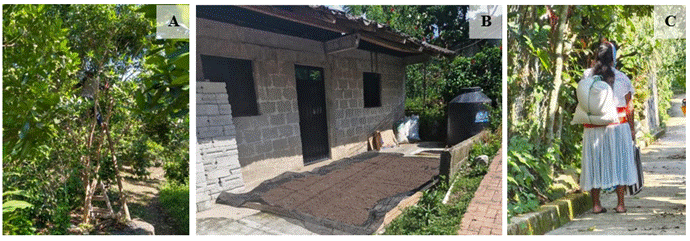 Figure 2 Allspice production in Lipuntahuaca, Huehuetla, Puebla. A) Harvesting green fruit from allspice trees; B) Sun- drying area for dried fruit; C) Transport of dried allspice fruit.