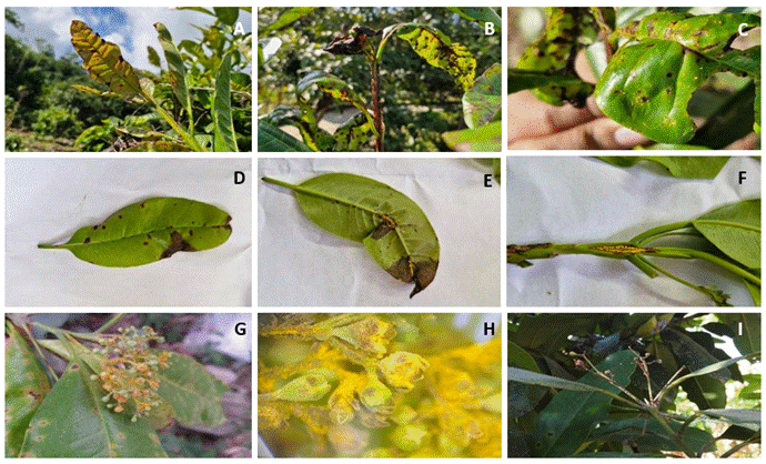 Figure 3 Symptoms and signs of rust (Austropuccinia psidii) in allspice cultivated in Huehuetla, Puebla, Mexico. A and B) Presence of rust on young leaves; C and D) Pustules on the upper side of the leaf; E) Pustules on the underside of the leaf; F) Pustules on the stem; G) Presence of rust on flower buds; H) View of flower buds infected with rust; I) Necrosis and drop of flower buds caused by rust.