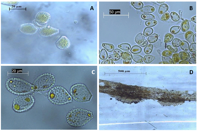 Figure 4 Uredinia and urediniospores of rust (Austropuccinia psidii) obtained from plant samples collected in Huehuetla, Puebla. A-C) Visualization of echinulate urediniospores with a truncated base; D) Visualization of uredinia in a cross-section of an allspice leaf.