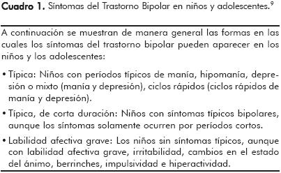 • Axelson y cols.2 compararon un grupo amplio de niños y adolescentes menores con trastorno bipolar con otro amplio grupo de pacientes con trastornos depresivos, trastornos ansiosos, TDAH y trastornos conductuales. Encontraron que la euforia y los niveles altos de energía distinguían al paciente joven con trastorno bipolar de aquel paciente con otros trastornos psiquiátricos. No se encontraron diferencias en cuanto a la inatención, la irritabilidad y otros síntomas, aunque los grupos con trastorno bipolar y depresión tuvieron con mayor frecuencia pensamientos e intentos suicidas y síntomas psicóticos que los sujetos de los otros grupos diagnósticos.