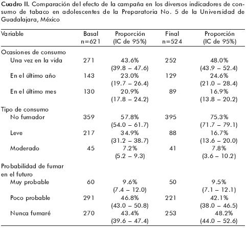 El efecto positivo de la campaña se apreció en el tipo de consumo de tabaco, puesto que hubo una reducción de la proporción de fumadores leves así como un incremento del número de no fumadores en la evaluación final con respecto a la basal; la proporción de fumadores moderados no se modificó en ambas evaluaciones. La frecuencia de consumo una vez en la vida, en los últimos doce meses, en el último mes, así como la probabilidad de fumar en un futuro cercano, no mostró modificaciones en la evaluación final con respecto a la basal (cuadro II).