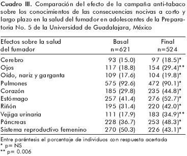 En la evaluación basal se apreció un alto nivel de conocimientos sobre los efectos nocivos del tabaco en el sistema pulmonar (92.6% de respuestas acertadas), un nivel medio de conocimiento sobre los efectos del tabaco en corazón, sistema reproductivo femenino, estómago y riñón (porcentaje de respuestas acertadas de 31% a 50.3%), mientras que el nivel de conocimientos sobre los efectos nocivos del tabaco en los demás sistemas orgánicos fue bajo (porcentaje de respuestas acertadas menor a 30%). En la evaluación final se observó que se mantuvo el nivel de conocimiento sobre aquellos sistemas orgánicos en los cuales el nivel era medio o alto, adicionalmente se apreció un incremento significativo en el conocimiento sobre los efectos nocivos del tabaco sobre el sistema ocular y las vías urinarias. El nivel de conocimiento sobre los efectos nocivos del tabaco en los demás sistemas orgánicos no mostró variaciones (cuadro III).
