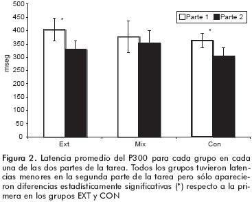 En cuanto a los resultados electrofisiológicos, la comparación entre la respuesta a los estímulos frecuentes y los estímulos infrecuentes (o diana) resultó en un componente positivo, de mayor amplitud para el estímulo diana, que aparece alrededor de los 300 mseg (figura 1) y que comparte las características de topografía y latencia del subcomponente P3b.30 Al analizar la latencia de dicho componente en los diferentes grupos, se encontraron diferencias significativas únicamente en los análisis intragrupos y, de manera similar a lo ocurrido con los tiempos de reacción, en todos los grupos la latencia del componente fue menor para la segunda parte de la tarea, aunque contrario a los resultados conductuales. En este caso, las diferencias alcanzaron significación estadística en dos de los grupos: los pacientes EXT y los sujetos CON (figura 2).