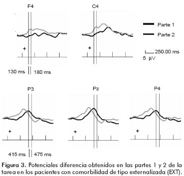 Second, EXT patients had greater amplitude of the same P300 component in Pz than CON subjects. This result may seem to contradict most of the research on ADHD and P300. Nevertheless, considering the behavioral data, specially that no differences in correct responses were found between patients an controls, it is posible to assert that the greater amplitude of the component represents an overactive compensation in attentional circuits, necessary in the EXT group in order to execute at the same level of nonADHD subjects.