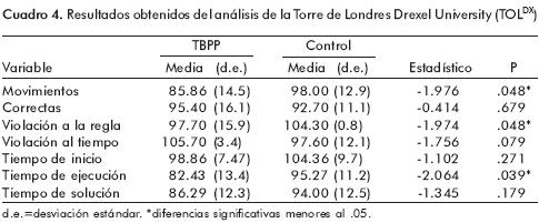 Es importante señalar que no se encuentran afectadas todas las capacidades para la solución de problemas complejos en el TBPP. De hecho, los adolescentes con TBPP de nuestra muestra no mostraron diferencias en las subpruebas de rompecabezas, historietas ni aritmética del Wechsler, así como en las variables de violación del tiempo, tiempo de inicio, tiempo de solución y número de respuestas correctas del TOLDX, ni en ninguna de las variables del WCST. Lo anterior puede asociarse con la capacidad conservada del TBPP para el cambio del set atencional, razonamiento abstracto, control de interferencia, razonamiento aritmético, pensamiento secuencial, interpretación de claves sociales y en la habilidad para solucionar problemas visoespaciales dentro de un período de tiempo específico.15,19