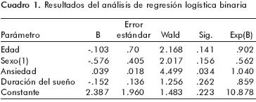 Para ello se llevó a cabo un análisis de regresión logística binaria. Siguiendo con el criterio de los objetivos anteriores, se usó el percentil 50 para dividir a la muestra en dos grupos según el grado de agresividad (alta y baja), y se tomó esta variable como dependiente. Como covariables se tomaron en cuenta la edad, el sexo (variable categórica), la ansiedad y la duración del sueño la noche anterior. Como se detalla en el cuadro 1, los resultados mostraron a la ansiedad como el único parámetro útil para el modelo de regresión, de entre todas las variables introducidas.