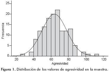 En relación con la agresividad en los participantes, la media fue de 63.93 y la desviación típica 14.26, estando el rango de puntuaciones obtenidas entre 29 y 113. Teniendo en cuenta que la puntuación en dicho cuestionario podía oscilar entre un mínimo de 29 y un máximo de 145, el rango expresado en nuestros datos no llega a alcanzar los valores máximos posibles. La puntuación media se encuentra también ligeramente por debajo del valor medio posible en la escala. La distribución de nuestras puntuaciones, tal como se aprecia en la figura 1, indica la presencia de valores no demasiado altos de agresividad en la situación de examen, ajustándose bastante a una distribución normal.