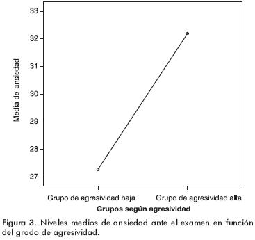 Para determinar posibles diferencias en la ansiedad ante un examen en función de los niveles de agresividad como rasgo, se llevó nuevamente a cabo un ANOVA, considerando el establecimiento de los dos grupos de sujetos según sus niveles de agresividad, realizado con anterioridad. El ANOVA univariante llevado a cabo, en el que se consideró como variable dependiente a la ansiedad frente a los exámenes, mostró diferencias significativas [F(1,141)=6.613 p=0.01], encontrándose mayores niveles de ansiedad en el grupo de sujetos con agresividad elevada ( =32.19; D.E.=11.88), en comparación con el grupo de sujetos de agresividad baja (