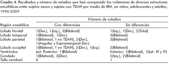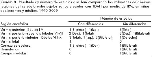 Los resultados del presente metaanálisis87,88 sugieren diferencias en ciertas estructuras cerebrales y que los estudios comparados son homogéneos entre sí y sin algún sesgo de publicación (cuadro 9). Sin embargo, en el mismo metaanálisis se encontraron artículos en los cuales no se hallaron diferencias entre los controles y los sujetos con TDAH (cuadro 10).