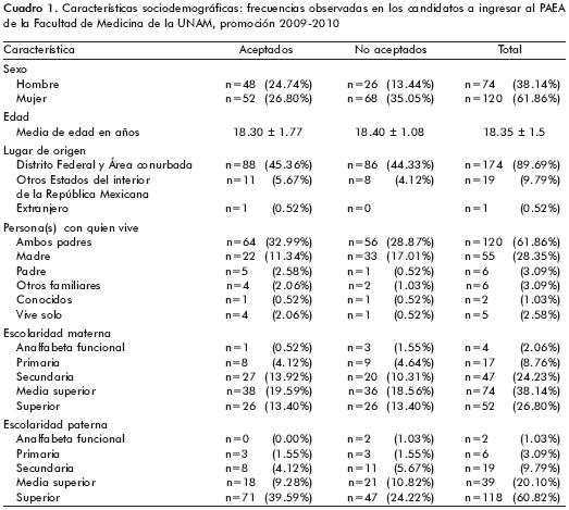 Se incluyó a 194 aspirantes, de los cuales fueron aceptados 100, con un predominio en la población femenina (61.86%) y una media de edad de 1 8.35 ± 1.5. Una cuarta parte de la población estudiada provenía de las Escuelas Nacionales Preparatorias, pero el mayor porcentaje de aceptación (20.1%) para ingresar al PAEA se observó entre los alumnos egresados de escuelas preparatorias privadas de alto nivel académico.