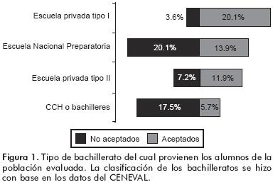 Alrededor de una cuarta parte de la población estudiada provenía de las Escuelas Nacionales Preparatorias, pero el mayor porcentaje de aceptación para ingresar al PAEA se observó entre los alumnos egresados de escuelas preparatorias privadas de alto nivel académico (figura 1).