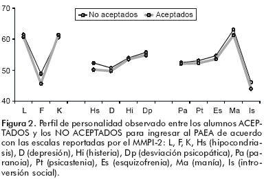 El perfil de personalidad obtenido por medio del MMPI-2 fue similar para los candidatos aceptados y los no aceptados. Los alumnos aceptados para ingresar al PAEA se caracterizaron por: presentar una gran energía y consolidar sus metas, ser sociables pero con poco compromiso con los demás, cuestionar el status quo y ser creativos; no obstante, se observó una tendencia a manipular a los demás para conseguir sus fines. Algunas de sus conductas pueden estar regidas por impulsividad. Los alumnos no aceptados presentaron estas características con una mayor energía que pudiera llevarlos a la desorganización.