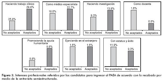 Los intereses profesionales (figura 3) se dirigieron hacia la práctica médica (43% de los ACEPTADOS, 52% de los NO ACEPTADOS). La docencia no fue considerada de interés, sin embargo, predominó entre los NO ACEPTADOS. La promoción de ayuda humanitaria discriminó a los ACEPTADOS. Al menos 10% de los candidatos ACEPTADOS comentaron que a futuro se visualizaban en una posición social elevada y con éxito.