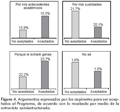 Los argumentos que los postulantes dieron para ser seleccionados en su ingreso al PAEA se observaron en dos vertientes: para los ACEPTADOS estuvieron en función del aspecto académico (tanto en sus antecedentes como en el esfuerzo que prometen imprimir para alcanzar sus objetivos); mientras que para los NO ACEPTADOS estos argumentos se mostraron menos definidos (hablan de sus características personales o no los tienen claramente ubicados) (figura 4).