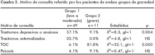 El motivo de consulta difirió entre ambos grupos: en el grupo de TOC grave, las obsesiones y compulsiones llevaron a la búsqueda de atención psiquiátrica a la mayoría de los pacientes, mientras que en el grupo de TOC leve a moderado la búsqueda de atención se debió a síntomas de trastornos depresivos o ansiosos (cuadro 2).