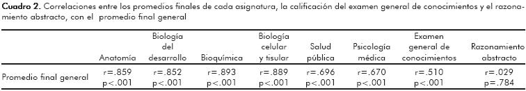 Anatomía (r=859), biología del desarrollo (r=852), bioquímica (r=.893) y biología celular y tisular (r=.889) fueron asignaturas cuyo promedio tuvo una correlación elevada con el promedio final general; mientras que salud pública (r=.696) y psicología médica (r=.670) presentaron una correlación moderada, y el puntaje de pensamiento abstracto (r=.029) no tuvo ninguna correlación con el mismo.