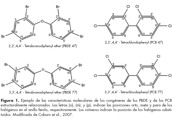 Las sustancias químicas desempeñan un papel muy importante en nuestra calidad de vida. Con ellas se fabrican productos que usamos diariamente como: alimentos, ropa, muebles, juguetes, autos, edificaciones, etc. Sin embargo, algunas sustancias químicas resultan nocivas para la salud y el medio ambiente. La contaminación ambiental es un problema mundial que actualmente preocupa a los países, ya que es responsable de una lista alarmante de enfermedades, muchas de las cuales afectan al Sistema Nervioso. Los componentes más frecuentes de la contaminación son las partículas suspendidas, los óxidos de nitrógeno, los metales pesados como el plomo y el mercurio y los compuestos organohalogenados como los bifenilos policlorinados (PCB por sus siglas en inglés) y los éteres difenílicos polibromados (PBDE). Los efectos de estos compuestos generalmente se han identificado después de su uso indiscriminado o en accidentes de contaminación a gran escala (enfermedad de Yoshuo en el Japón).1-3 Los organohalogenados como los PCB son un claro ejemplo de sustancias químicas sintéticas con propiedades que las hacen útiles para una amplia gama de aplicaciones, y que después de su distribución y comercialización intensiva se descubre que poseen características indeseables por las que se afecta adversamente la salud humana y el ambiente.4-9 Numerosos estudios han puesto de manifiesto los efectos tóxicos de estos compuestos y la legislación ha prohibido o restringido severamente el uso de muchos de ellos.10-12 Sin embargo, los organohalogenados permanecen omnipresentes en el medio ambiente. Por ejemplo, se estima que más de 1.3 millones de toneladas de PCB se produjeron en todo el mundo hasta 1993 y todavía se tienen cifras significativamente altas en el medio ambiente.13 Tras la prohibición de su producción y uso, los niveles de PCB en la fauna silvestre y el medio ambiente han disminuido lentamente, pero nuevos organohalogenados han tomado su lugar y aumenta su concentración en el medio ambiente de forma alarmante. Los compuestos bromados retardantes de flama son algunos ejemplos que han surgido recientemente. Los PBDE son compuestos organohalogenados que comparten características estructurales con los PCB (figura 1). Se conocen 209 moléculas de los PCB y 209 de los PBDE, denominadas "congéneres"; la diferencia se basa en la posición y número de bromos o cloros en la molécula.14-16 Éstas son sustancias químicas que inhiben la ignición y propagación del fuego o retardan la fase inicial del mismo.17 Se encuentran en una variedad de bienes de consumo, como artículos electrónicos y electrodomésticos, materiales de construcción, espumas, telas y muebles tapizados, etc.18-21