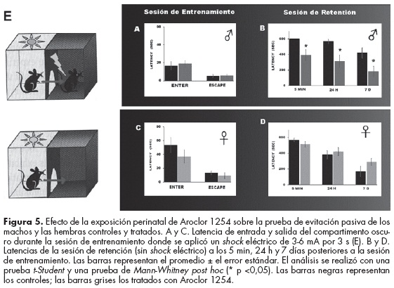 El óxido nítrico es un neurotransmisor importante en los procesos de aprendizaje y la memoria. La inhibición de la NOS produce alteraciones de estas funciones cerebrales e inhibe la potenciación a largo plazo (LTP, una forma de plasticidad sináptica).80-84 Con base en los antecedentes de que los PCB inhiben la actividad de la enzima sintasa del NO,43,44,70,73-75 nos interesó conocer el efecto de la exposición perinatal a los PCB (Aroclor 1254) sobre la actividad de la NOS, y la expresión de las proteínas presinápticas, sinapsina (SynI) y sinaptofisina (Sph) que participan en el establecimiento del aprendizaje y la memoria.63,85-89 Administramos Aroclor 1254 durante la gestación del día 10-19 y las crías se dejaron crecer hasta los 3 meses de edad. Se realizó la prueba de evitación inhibitoria (para la medición de la memoria espacial). Posteriormente llevamos a cabo un estudio en un grupo para ver la actividad de la NOS (expresada como la actividad de la NADPH-d), en cortes de cerebro de diferentes regiones cerebrales (corteza prefrontal, hipocampo y tálamo dorsal) y en otro cuantificamos la nNOS, SynI y Sph por medio de Western Blot. Mostramos un aumento de la actividad de la NOS en todas las regiones cerebrales estudiadas en las ratas tratadas comparadas con los controles, principalmente en los machos. Con respecto a la expresión de las proteínas presinápticas SynI y Sph, se observó un decremento que no fue significativo. La prueba de aprendizaje mostró una disminución significativa de la adquisición y/o consolidación del aprendizaje y memoria en las ratas macho tratadas (figura 5).74 La exposición perinatal a los PCB altera la síntesis y expresión del NO y de proteínas que participan en la consolidación de la memoria con mayor efecto en los machos. El efecto de los PCB sobre la inhibición de la NOS parece no ser a largo plazo, ya que se observa un incremento de su actividad en las ratas tratadas, aunque una disminución en su expresión; sin embargo, este efecto sí tiene una repercusión en la función. Hay que hacer notar que aproximadamente 50% de las crías mueren antes de llegar a los tres meses de edad, por lo que probablemente estemos estudiando a las menos afectadas.