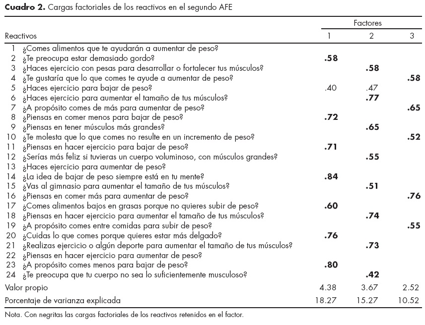 Con lo que respecta a la estructura factorial de la escala, se confirma que está conformada por los tres factores propuestos:18 perder peso, ganar peso e incrementar tono o masa muscular. Sin embargo, en el presente estudio se observaron ciertas divergencias con respecto a la estructura original, que fueron: 1. Los factores sólo agruparon 20 de los 24 reactivos; 2. aunque explicaron un porcentaje de la varianza superior a 40%, fue sustancialmente menor al previamente reportado;18 3. no obstante, los valores propios y las varianzas explicadas por los factores derivados mostraron un sustancial mayor balance que en el estudio original,18 donde sólo el primer factor explicó 37.7% de la varianza total; y 4. cambió el orden de los factores, de modo que perder peso mostró ser el más relevante, seguido del referente a ganar tono o masa muscular y, por último, el de ganar peso.