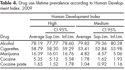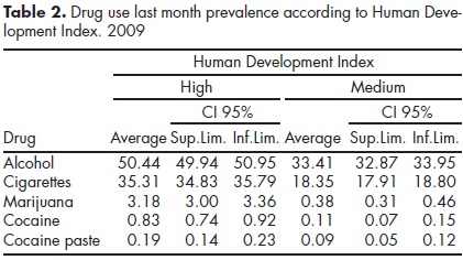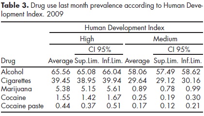 Table 2 shows that prevalence of drug consumption during the month prior to the survey is higher in countries with high HDI compared with medium HDI countries. The same situation occurs with the prevalence of drug consumption in the last year shown in table 3.