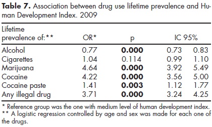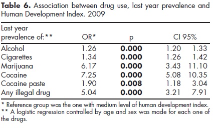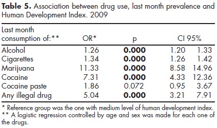 To evaluate the effect of HDI with drug use, several logistic regressions were performed, taking into account the sample design and controlled by age and sex. Tables 5 and 6 show that consumption in the last month and last year is higher in countries with a high level of human development compared with the ones that have medium human development index, excepting cocaine paste in which there is no difference between both groups of countries.