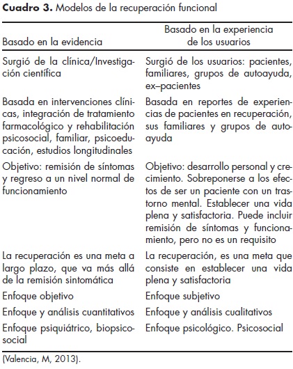 Aunque se han identificado sus diversos componentes, aún no está claro cómo los diferentes elementos de la "recuperación funcional" se pueden relacionar unos con otros.53 Al respecto se ha encontrado que existen dos modelos o enfoques: uno, basado en la evidencia, que implica el abordaje y la reducción de los problemas "objetivos" relacionados con la enfermedad (mejorías en los síntomas y en el funcionamiento), y el otro basado en la experiencia de los usuarios, que debe reflejar los cambios "subjetivos" en la vida del paciente (mejorar la autoestima, rechazar el estigma de la enfermedad).37 Las principales características de estos dos modelos se ilustran en el cuadro 3.