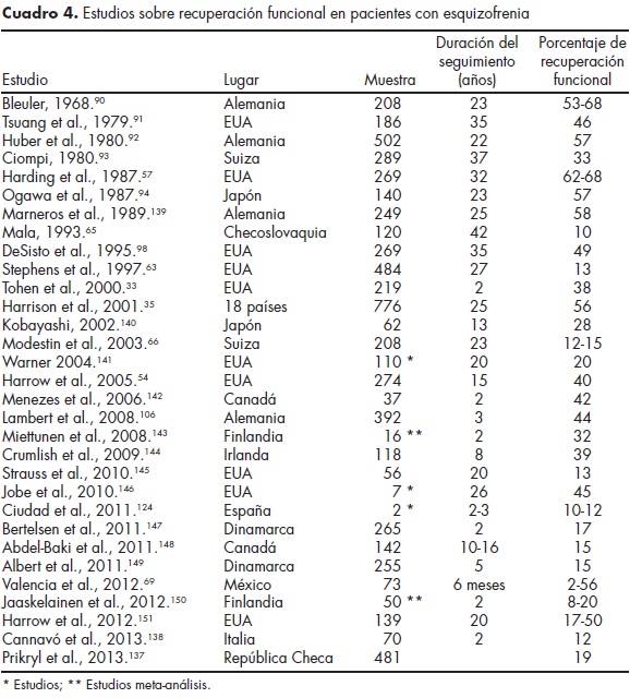También se han desarrollado criterios para evaluar la recuperación funcional que incluyen la combinación de aspectos clínicos y psicosociales, que se deben mantener por lo menos por dos años consecutivos, incluyendo dimensiones como el funcionamiento psicosocial, el funcionamiento cognitivo y la calidad de vida. En el presente artículo se revisa la investigación respecto a los conceptos de remisión sintomática y recuperación funcional en los pacientes afectados por esta patología, incluyendo estudios clínicos, epidemiológicos, estudios de revisión y meta-análisis publicados entre enero de 1970 a julio de 2013. Se incluyeron 62 estudios sobre remisión sintomática/recuperación funcional, con un total de 94 940 pacientes, con un seguimiento de seis meses a 37 años. También se incluyeron 32 estudios de recuperación funcional, con un total de 6 483 pacientes, con un seguimiento de dos a 42 años. Los resultados indican que entre el 20 y el 97% de los pacientes pueden lograr la remisión sintomática, mientras que entre el 10 y el 68% alcanzan la recuperación funcional. Se ha recomendado el uso de estos criterios en la práctica clínica y en la investigación científica.