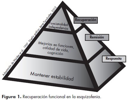 En los últimos 50 años los objetivos terapéuticos para el tratamiento de la esquizofrenia han ido cambiando paulatinamente; desde lo que se consideró en un principio como logros importantes respecto a modestas mejorías en los pacientes como el autocuidado, el control de la agresión y la evitación de autolesiones, hasta un control más efectivo de la sintomatología psicótica.34 El modelo que actualmente se propone ha sido denominado como "recuperación funcional", que tiene como condición sine qua non a la remisión sintomática. Debido a esto, algunas metas del tratamiento en cuanto a lograr una rápida reducción de los síntomas (remisión) a corto plazo con el uso de los antipsicóticos, y lograr la estabilidad clínica del paciente han sido rebasadas y reformuladas debido a que éstas ya no son consideradas como las metas finales del tratamiento. En consecuencia, se ha planteado como nueva meta factible de alcanzar la "recuperación funcional", sobre todo tomando en cuenta que el tratamiento basado en la evidencia indica que un número considerable de personas con esquizofrenia se pueden recuperar, aunque evidentemente no de una manera total. Una aportación importante en el estudio y entendimiento de esa "recuperación funcional" es la de Weiden y Zygmunt,50 quienes desarrollaron un esquema conformado por tres conceptos, cada uno con sus objetivos correspondientes. Cada concepto corresponde a una instancia que forma parte de una pirámide, en cuya base se ubica al concepto de "respuesta al tratamiento" y tiene como meta mantener la estabilidad clínica del paciente. Sobre la base y en una segunda instancia se encuentra el concepto de "remisión", que consiste en obtener mejorías en el funcionamiento social, cognitivo y en la calidad de vida. En la parte superior de la pirámide y como instancia final y principal, se ubica al concepto de "recuperación funcional", que se refiere a un paciente funcional y socialmente autónomo (figura 1). Aunque existen diversas definiciones del tema de estudio, todavía no existe un consenso internacional respecto a tener una definición única de "recuperación funcional" y saber cuál es su significado. Para ilustrar este punto se incluyen sólo algunos ejemplos. Se considera a la recuperación como: "la habilidad de funcionar en la comunidad, socialmente y vocacionalmente, así como estar relativamente libre de la psicopatología de la enfermedad".44 También puede consistir en "incrementar las habilidades del paciente para afrontar satisfactoriamente los desafíos de la vida y el manejo de sus síntomas". El concepto enfatiza la capacidad de la persona para tener esperanza y llevar una vida significativa que incluya logros al máximo nivel en los aspectos siguientes: 1) poder lograr autonomía de acuerdo a sus deseos y capacidades, 2) demostrar tener dignidad y respeto a sí mismo, 3) aceptar que su vida debe incluir su integración total en su comunidad y 4) retomar su desarrollo normal.51 O bien, es "la inclusión de niveles normativos de funcionamiento social y ocupacional, vida independiente y remisión de síntomas psiquiátricos".28 Finalmente, se incluye el testimonio de un paciente con esquizofrenia, en cuanto a lo que la "recuperación funcional" significa para él: "Quisiera mantenerme productivo, estar en contacto con la gente, escribir cartas como lo hacía antes, tener un trabajo, limpiar mi cuarto, lavar mi ropa".52