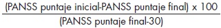 Por su parte, la "remisión" ha sido definida como: "el estado en el cual el paciente se encuentran libre, o sin la presencia de síntomas clínicos significativos",43 que refleja cuántos pacientes pueden presentar sintomatología. Ha sido propuesta una fórmula para calcular el porcentaje de reducción de síntomas utilizando la escala PANSS,43 expresada de la siguiente manera: