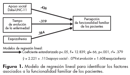El modelo de regresión lineal mostró que los pacientes con mayor tiempo de evolución y con diagnóstico de esquizofrenia predicen disfuncionalidad; en cambio el apoyo social predice funcionalidad (p<.001). En los familiares, a mayor tiempo de evolución se pronostica disfuncionalidad en tanto que el apoyo social predijo funcionalidad (p<.001).