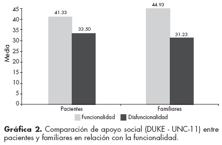 Con respecto al apoyo funcional social (Duke-UNC-11), los resultados de comparación muestran que no existe diferencia (t=1.170, gl=136, p=.244) entre el apoyo funcional social percibido por los familiares (̅x= 40.36) y los pacientes (̅x=38.07). Así mismo, como se observa en la gráfica 2 no existe diferencia en la percepción de funcionalidad (t=1.762, gl=84, p=.082) y de disfuncionalidad (t=-702, gl=50, p=.486) familiar de ambos grupos.