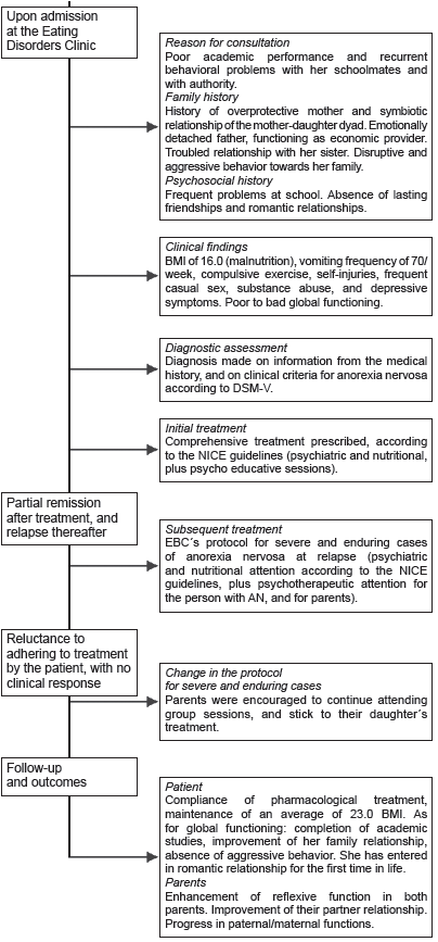 A comprehensive treatment was prescribed for K at the EBC, according to the NICE guidelines (National Institute for Clinical Excellence, 2004), including attention by a psychiatrist and a nutritionist, plus psycho-educative sessions. After 25 weeks of treatment, medical stabilization, decrease of vomiting frequency and compulsive exercise was achieved. However, K remained in impasse for the following three years, showing amenorrhea, and a BMI of 18.5, indicative of poor nutrition. As for behaviors such as casual sex, abusive behavior with her peers, and violent behavior towards her parents also remained unchanged. Despite the impasse, it should be noted that during those three years she presented decrease of scholar absences, of defiant attitudes towards school authority, and of substance use as well; so she was able to complete high school.