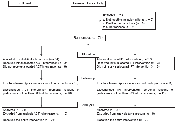 By quota sampling, participants were enrolled and assigned randomly to receive ACT (12 sessions once a week) or IPT (20 sessions once a week). The assignment sequence was made by a researcher with no clinical participation in the trial and was double blind for participants as well as for the researchers who evaluated the results. Therapeutic groups were of no more than 12 participants and every session lasted an hour and a half. Interventions were applied by researchers trained and with expertise in the application of ACT and IPT with gender perspective. The number of sessions for each psychotherapy were based on the intervention manuals and previous literature, all delivered with gender perspective which makes them friendly to this population (Vargas-Salinas & Reyes-Ortega, 2016; Reyes-Ortega & Vargas-Salinas, 2016; Biagini-Alarcón et al., 2020).