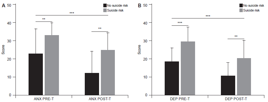 Figure 2 Anxiety and depression were higher in IPV exposed women with suicide risk before and after two types of interventions.A) Anxiety: ** p ≤ .01 no-suicide risk vs. suicide risk.B) Depression: *** p ≤ .001, ** p ≤ .01 no-suicide risk vs. suicide risk. Regardless of the type of intervention and the presence of suicide, anxiety and depression decrease after interventions *** p ≤ .001. Data expresses the mean (± SD).