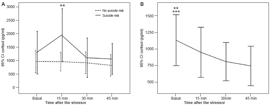 Before the interventions, cortisol secretion varied according to the time and the interaction time × suicide risk (X2 Wald = 13.28, df = 3, 197, p = .004; X2 Wald = 8.89, df = 4, 197, p = .03). Neither suicide risk alone nor the age affected cortisol secretion (X2 Wald = .53, df = 1, 197, p = .46; X2 Wald = .008, df = 1, 197, p = .93, respectively). As shown in Figure 3A patients with suicide risk, before the intervention, showed a significant rise in cortisol after 15 min of the cognitive test (p = .002 vs. basal) followed by a recovery after 30 min (p = .005 vs. 15 min). However, patients with no suicide risk showed a flattened profile without cortisol changes (p = 1.0). After the interventions, cortisol secretion varied only according to the time (X2 Wald = 21.97, df = 3, 197, p ≤ .001). The interactions time × intervention, time × previous suicide risk, and time × post suicide risk were not significant (X2 Wald = 7.31, df = 4, 197, p = .12; X2 Wald = 3.33, df = 4, 197, p = .34; X2 Wald = 4.08, df = 4, 197, p = .39). Figure 3B illustrates that after the psychotherapies, patients showed a significant decrease of cortisol (basal vs. 30 min p = .02; basal vs. 45 min, p≤ .001).