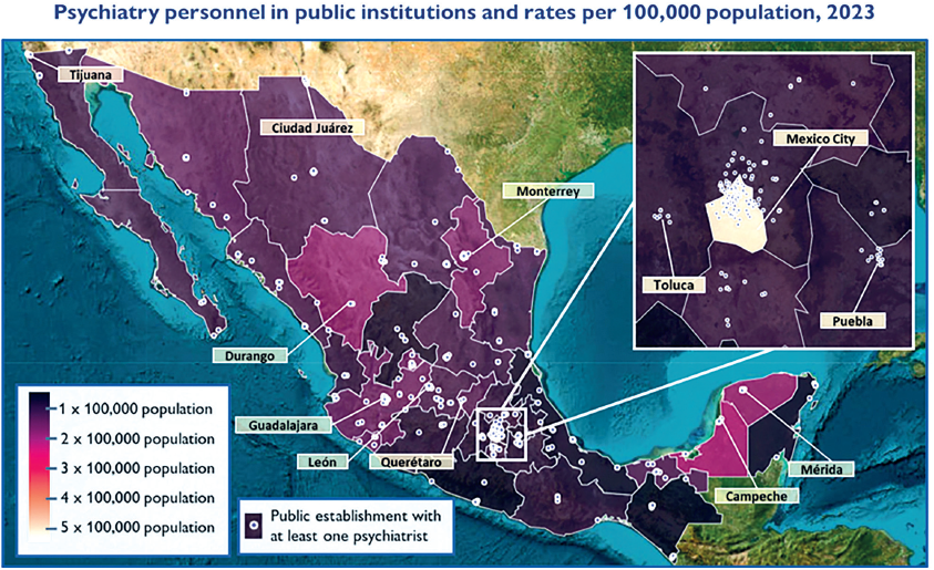 In short, our study describes the acute mental health provider shortage in Mexico’s public health sector. This deficit significantly hinders access to mental health services, resulting in the underdiagnosis and undertreatment of severe, prevalent mental health and substance-related disorders. These consequences, in turn, contribute to diminished quality of life among affected individuals and their loved ones, and higher rates of disability, violence and social exclusion. A considerable regional disparity between Mexican states was also highlighted, contributing to the inequity of mental health services across the country. Our study highlights the urgent need to strengthen Mexico’s public mental healthcare provision. This includes increasing funding for mental health programs, improving coordination across healthcare institutions, and integrating efforts from various sectors to reduce stigma and boost mental health awareness. The development of community-based services and continuous training for non-specialist primary care providers is also crucial. These initiatives could potentially mitigate the disparities and barriers identified in mental healthcare, contributing to a more equitable and effective system, although their success will depend on effective implementation and continuous evaluation.