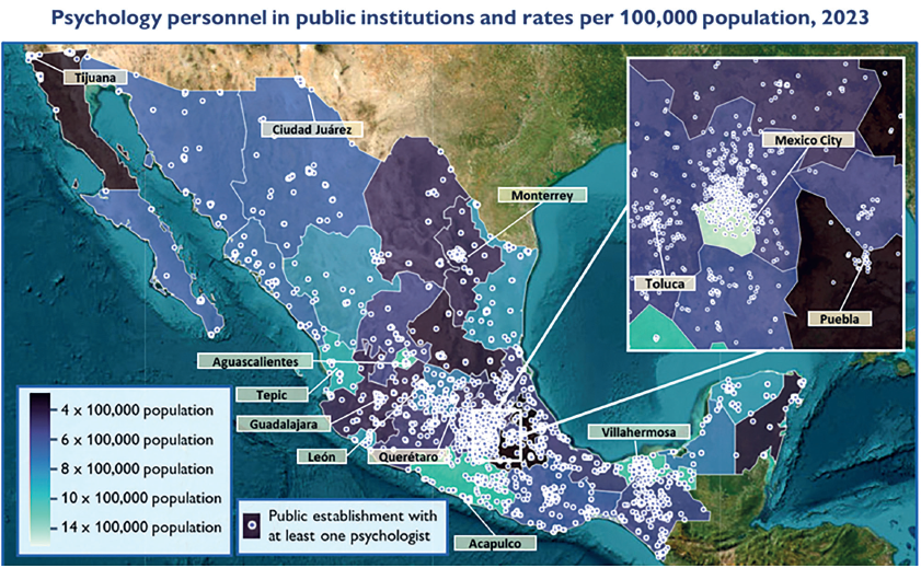 Psychologists in public institutions in Mexico. State color maps represent the rate of public institution psychologists per 100,000 inhabitants in 2023, according to the population projections of the National Population Council (CONAPO). Blue dots represent public establishments with at least one psychiatrist. Public institutions include: Secretaría de Salud (Ministry of Health), Instituto Mexicano del Seguro Social (IMSS, Mexican Institute of Social Security), Instituto de Seguridad y Servicios Sociales de los Trabajadores del Estado (ISSSTE, Mexican Institute for Social Security and Services for State Workers), Centros de Integración Juvenil (CIJ, Juvenile Integration Centers), Sistema Nacional para el Desarrollo Integral de la Familia (DIF, System for the Integral Development of the Family), University Hospitals, IMSS Bienestar, Pemex (Mexican Petroleum), Secretaría de Defensa Nacional (SEDENA, Secretariat of National Defense), Secretaría de la Marina (SEMAR, Secretariat of the Navy), State Medical Services, Municipal Medical Services. Tags for the largest metropolitan areas, as well as cities with higher concentrations of psychologists, are included.
