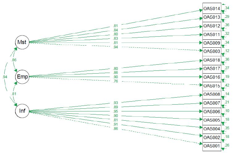 Before performing CFA, a descriptive analysis of the items comprising the OAS was performed. The results confirmed that the 18 questions have a normal univariate distribution, while the bias and kurtosis were well below the cutoff points that would suggest a need to transform the data (Kim, 2013). In the corrected item-total correlation, since the lowest value corresponded to the OAS item 15 (ritc = .64) and the highest to the OAS item 08 (ritc = .86), none of the items were eliminated. The Mardia coefficients were significant (MKurt = 23.33, p < .001; Mskew = 2146.26, p < .001), suggesting that the data did not follow a normal multivariate distribution. Given the above and the fact that the items corresponded to an ordinal measurement level, it was decided that diagonally weighted least squares (DWLS) was the most appropriate estimator (Li, 2021; Shi & Maydeu-Olivares, 2020).