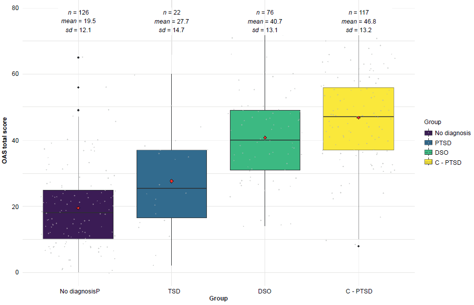 Figure 2 Box Plot for OAS Scores in ITQ Subgroups.Note: PTSD: posttraumatic stress disorder; DSO: disturbances in self-organization; C-PTSD: complex posttraumatic stress disorder