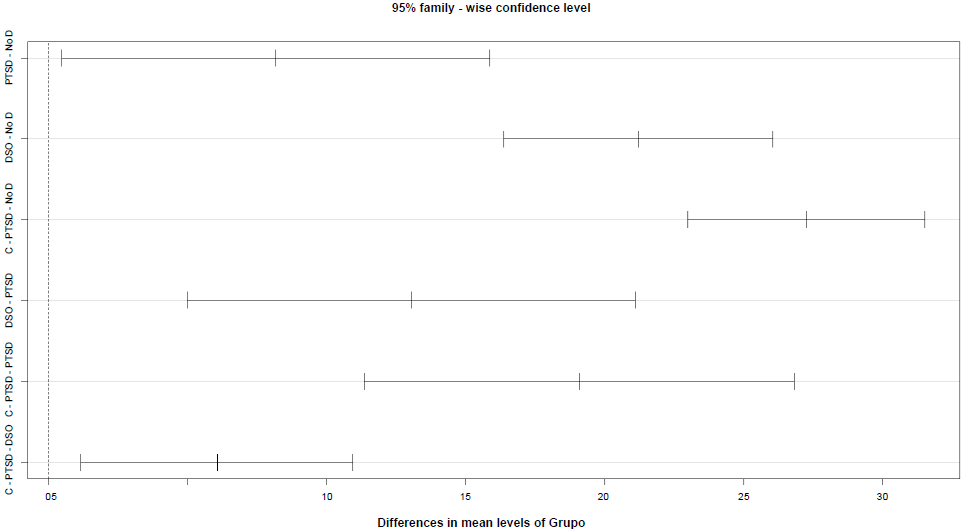 Based on the results, four groups were identified: (1) C-PTSD, comprising individuals who met the diagnostic criteria for both the PTSD and DSO clusters; (2) PTSD, including individuals who met the criteria for PTSD but not for DSO; (3) DSO, consisting of individuals who met the criteria for the DSO cluster but not for PTSD; and (4) No Diagnosis, referring to individuals who did not meet the criteria for either PTSD or DSO.
