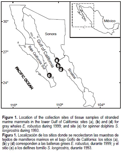 Four gray whales (Eschrichtius robustus Lilljeborg, 1861) were found stranded along the eastern coast of the Gulf of California between February 17 and March 18, 1999 (fig. 1a, b and d). Muscle, kidney and liver samples were taken from every specimen for analysis. In the case of spinner dolphins (Stenella longirostris Gray, 1828), eleven stranded specimens were found dead in the Bay of La Paz (fig. 1c), in the lower Gulf of California in August 7, 1993. Specimens were identified, measured and weighed, prior to dissection and separation of every sample. The time elapsed between their stranding and sampling, was from 1 to 5 days depending of the accesibility of the stranding sites. Samples were kept frozen until the laboratory work was initiated. In the laboratory, portions of the different tissues were freeze-dried (Labconco freeze-drying system) for 48 hours at 40-133 x 10-3 mBar and -49°C; dried samples were ground with an automatic agate mortar (Retsch) for 10 minutes.