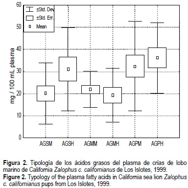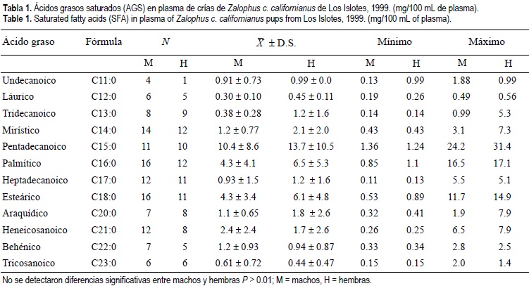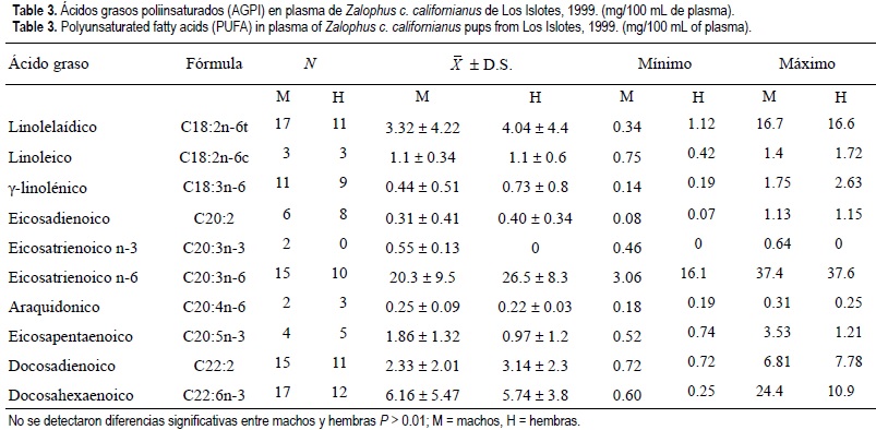 La concentración y el tipo de ácidos grasos plasmáticos, de crías del lobo marino de California de Los Islotes, B.C.S., en 1999, fue muy variable entre machos y hembras, en algunos casos (C13:0, C15:1, C18:1n-9t). El C20:3n-3 se identificó sólo en machos y en pequeñas cantidades. Otros AG tuvieron en promedio la misma concentración entre grupos (C11:0, C16:1, C17:1, C24:1, C18:2n-6c, C20:4n-6).