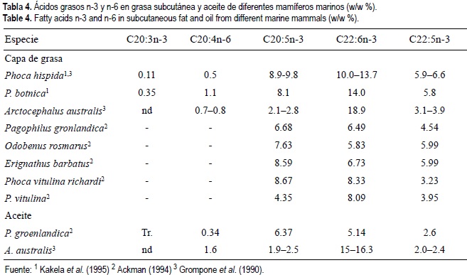 Los AG n-3 han sido estudiados en diferentes organismos marinos ya que se consideran de suma importancia en el aspecto salud-enfermedad pues se ha demostrado que un amplio consumo de éstos disminuye la incidencia de enfermedades cardiovasculares, entre muchas otras. Algunas grasas y aceites de mamíferos marinos no sólo han sido estudiados, sino que son aprovechados como fuentes de omega 3. En la tabla 4 se presenta la concentración de ácidos grasos n-3 y n-6 en la grasa y/o el aceite de algunos mamíferos marinos. Como se puede observar con relación al C20:4n-6, los valores van desde 0.34 hasta 1.1%, y son mayores a los encontrados en el presente trabajo. Sin embargo, se debe considerar que estos últimos son niveles plasmáticos, mientras que los reportados anteriormente están ya depositados en diferentes órganos. El C20:3n-3, el C20:5n-3 y el C22:6n-3 encontrados en esta investigación tuvieron un comportamiento similar a lo reportado por Käkelä et al. (1995) para grasa y por Ackman (1994) para aceite: niveles trazas del primero, intermedios del segundo y concentraciones altas del tercero, inclusive tan altas como las presentes en el aceite de Pagophilus groenlandicus, por lo que eran de esperarse valores elevados de este ácido graso en la capa de grasa y otros órganos de las crías estudiadas. Sin embargo, Ackman (1994) no reporta este comportamiento cuando analizó ácidos grasos en grasa subcutánea (tabla 4).