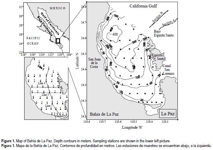 To accomplish the study, data obtained by the Centro de Investigaciones Biológicas (CIBNOR, La Paz) were used of the same variables, measured in July 1996 at the Espíritu Santo Shoal (area adjacent to the bay). The salinity and temperature profiles were recorded with a Sea Bird 25 CTD in two sections, A with 17 stations and B with 21 (fig.1).